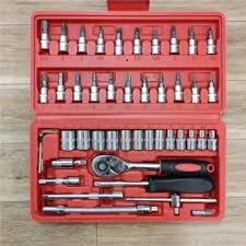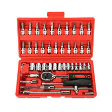 جعبه بکس 46 پارچه 1/4 ، دارای کیفیت مشابه تایوانی ، آلیاژ : فولاد کروم وانادیوم سایز درایو : 1/4 ، مکانیسم ساخت : 6 پر ، سخت کاری شده و حرارت دیده شده و ماشین کاری شده می باشد . استاندارد متریک ، دارای 13 عدد سری بکس درایو 1/4 می باشد . سایز بکس ها : 4 ، 4.5 ، 5 ، 5.5 ، 6 ، 7 ، 8 ، 9 ، 10 ، 11 ، 12 ، 13 و 14 میلیمتر و دارای 21 عدد سری بکس پیچگوشتی شامل: 3 عدد سری پیچگوشتی چهارسو خاردار در سایزهای PZ1 ، PZ2 و PZ3 و 3 عدد سری دوسو در سایزهای SL4 ، SL5.5 و SL7 و 3 عدد سری چهارسو در سایزهای PH1 ، PH2 و PH3 و 6 عدد سری آلن ستارهای در سایزهای T10 ،T15 ،T20 ،T25 ،T30 ،T40 و 6 عدد سری آلن در سایزهای HEX7 ،HEX6 ،HEX5 ،HEX4 ،HEX3 ،HEX8 دارای 1 عدد آچار جغجغه ای به طول 15/5 سانتیمتر با درایو 1/4 اینچ ، دارای 1 عدد دسته ی پیچگوشتی به طول 15 سانتیمتر با درایو 1/4 اینچ ، دارای 2 عدد افزایندهی طول در سایزهای 10 و 5 سانتیمتر ، دارای 1 عدد افزایندهی طول فنری 14.5 سانتیمتری ، دارای 1 عدد آچار T به طول 11.5 سانتیمتر ، دارای 1 عدد سری آلن ، دارای 3 عدد آچار آلن با طول 4.5 سانتیمتر ، دارای 1 عدد لقلقه به طول 4 سانتیمتر و دارای باکس ضد ضربه بی ام سی می باشد .